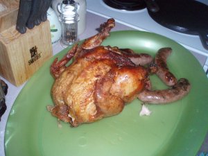 Anywho….I brought that little bastard into the house after a two our roast on the grill. This time I knew the chicken was cooked properly! When I picked the leg off the chicken the meat slid right off. The Wifey managed to get the other leg off and gave it a gentle shake..resulting in the meat falling on to her plate. Yeah, it was done!